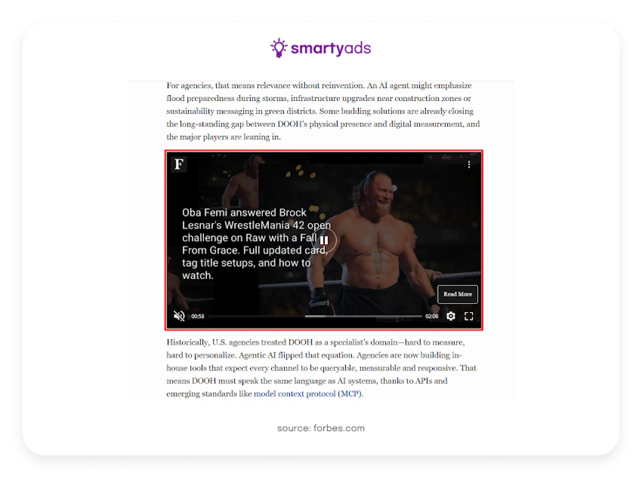 - Out-Stream Video Ads — auto-play units embedded in article text or content feeds. No dedicated video player needed. They bring video revenue to publishers without their own video content