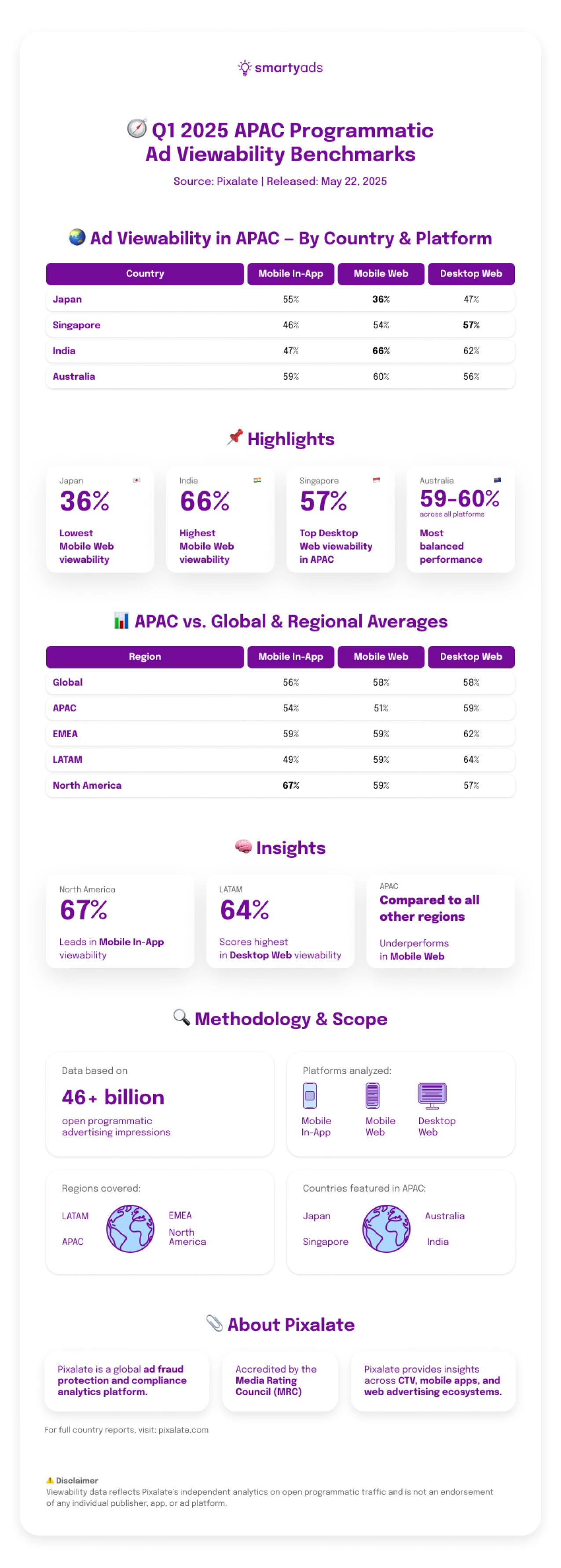 - Desktop web ad viewability: 58% globally, 59% in APAC, but only 47% in Japan and 57% in Singapore