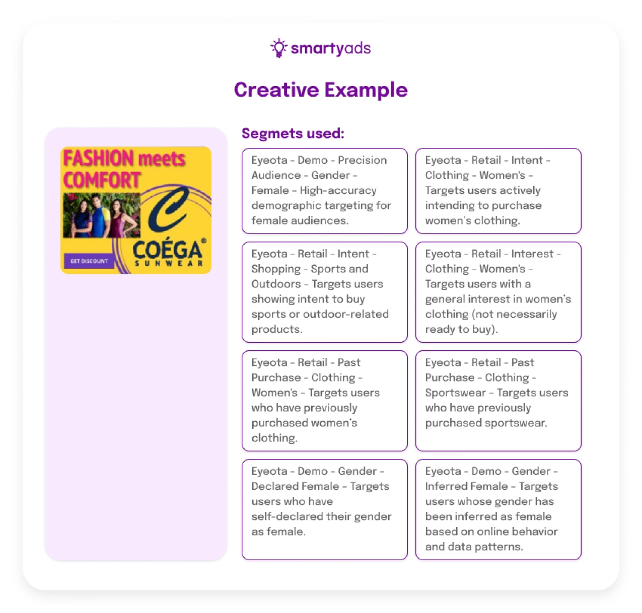 Take the Coéga Sunwear: instead of just targeting "women who buy clothes," they used Eyeota to identify women specifically interested in sports and activewear.