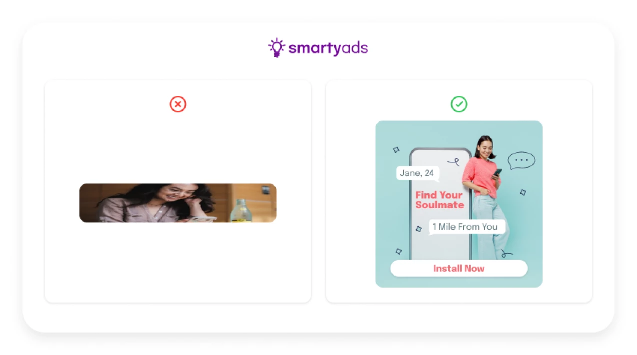 Not all visuals are created equal. For example we have advertiser with dating app ad that shows just a blurry, low-quality photo of a person with no context. There’s no story, no hint of who they are or what they enjoy — it feels flat, impersonal, and easy to ignore. Users might glance at it, but it doesn’t spark curiosity or connection.