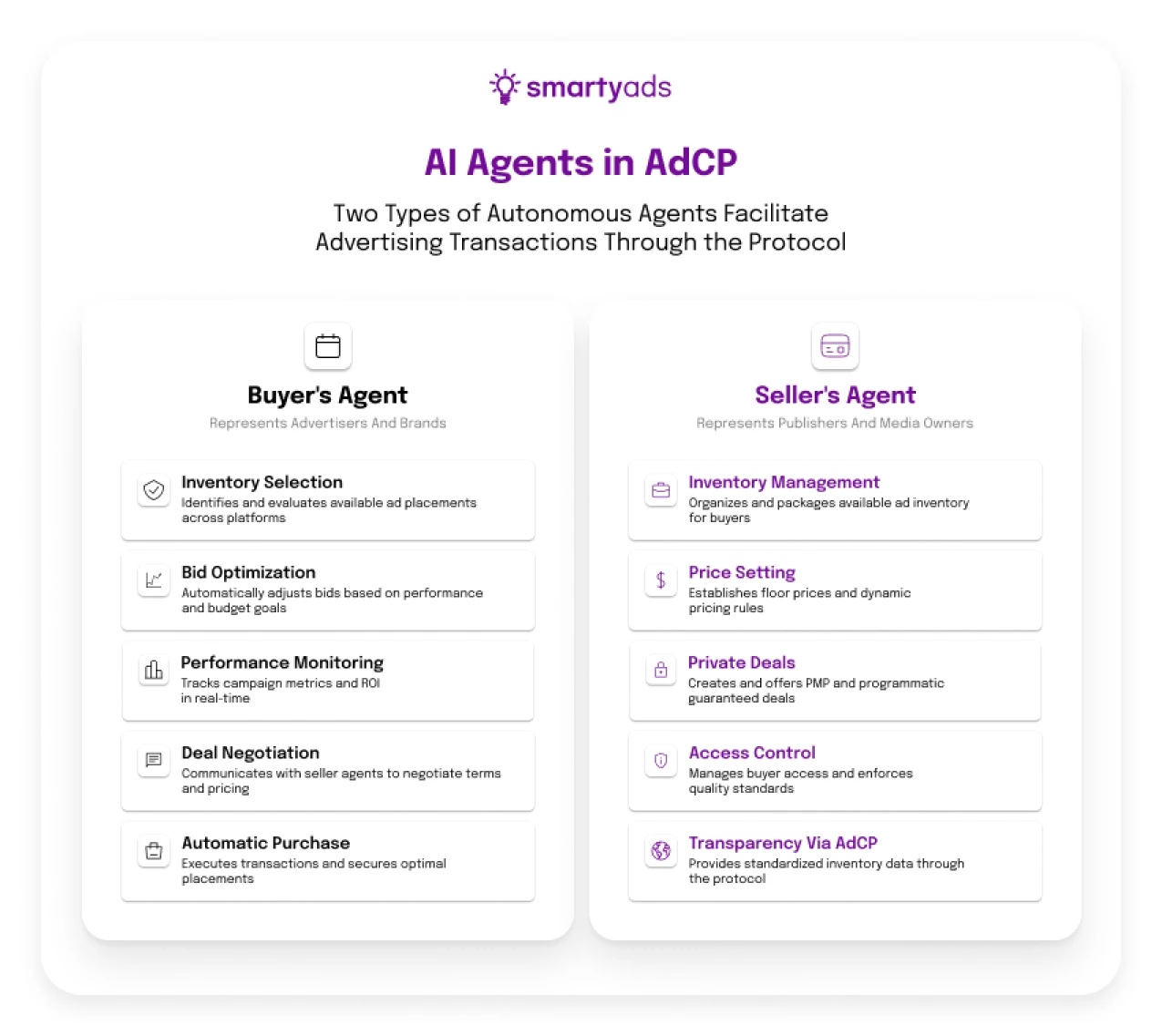 - Seller's agents represent publishers and media companies. They're controlling inventory availability, pricing, sales rules, creating private deals, managing buyer access through AdCP. All from the supply side.